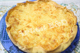 5. Numa tigela, junte o molho bechamel com os ovos. Tempere com um pouco de sal e pimenta. Bata tudo muito bem com uma vara de arames. Espalhe por cima da tarte.